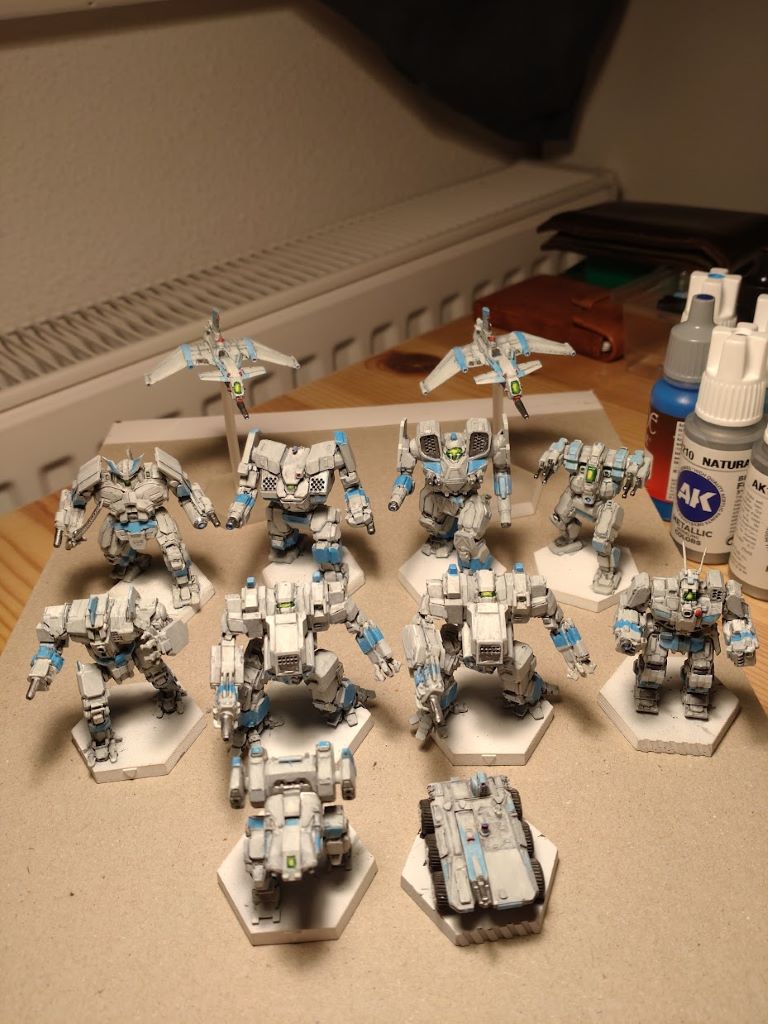 Грунтовка Vallejo White, базовые цвета AK Medium Grey и Ducat Blue, проливка Vallejo Black Wash, доводка сборной солянкой Vallejo+AK.