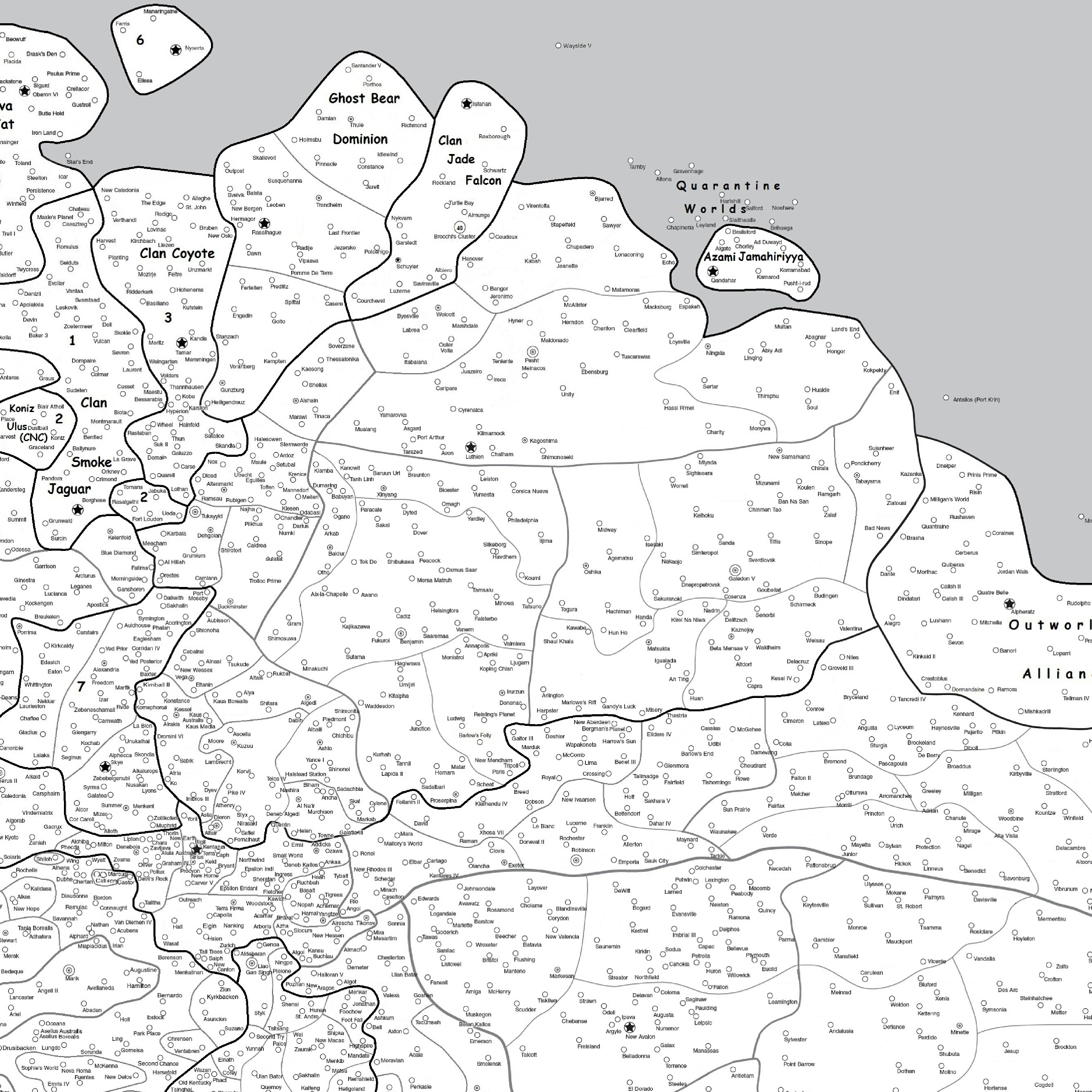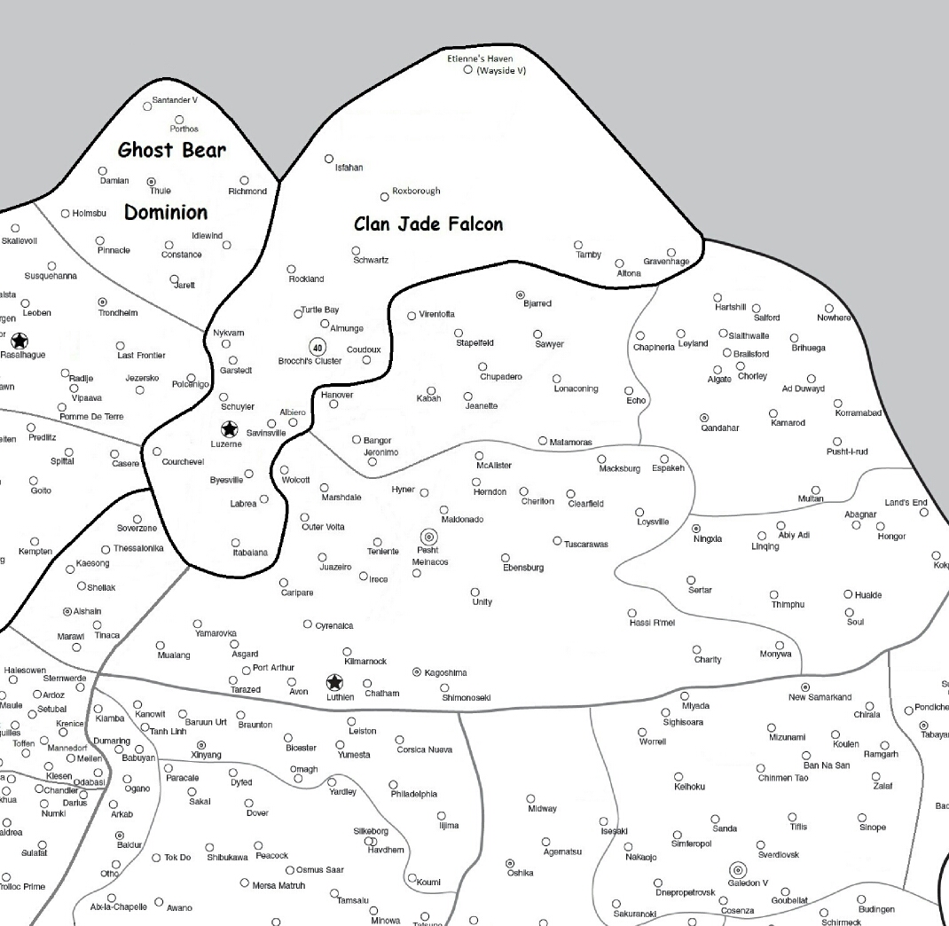 Альтернативный таймлайн дошёл уже до середины 3070-х и самое время прикинуть -- как будет идти разорячка в Кланспейсе. Другая расстановка фигур, раннее начало -- это ладно, конструировать эту арку в деталях, какие кластеры, с кем и где воевали, я всё равно пока не собираюсь.