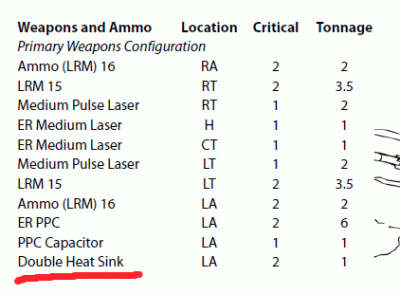 В левой руке – теперь только боеприпасы (две тонны, прикрытые CASE) для единственной ракетной установки, смонтированной в левом полуторсе, но теперь это Streak LRM 15, тяжелая и лишенная возможности стрелять вне прямой видимости, но зато экономичная. Остальное вооружение – чисто энергетическое, Large Pulse Laser в правой руке, два Medium Pulse Laser в полуторсах и ER Medium Laser в голове. За охлаждение отвечают 14 двойных радиаторов.