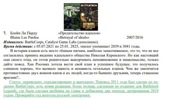 Версия 2.0 от 30.06.2020. — Второе издание, с исправлениями и дополнениями, переведенное с издания Battletech Legends 2016 г.