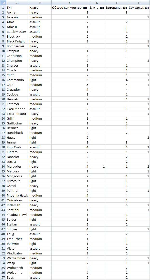 Не найдя искомого придется обратиться и к меньшинству (1-2 шт). Тут разнообразие мехов. Всего 43 типа (см. прикрепленный файл). Все перечислять не буду. Сразу отмечу, нам мой взгляд наиболее вероятные варианты появления в МВО мехов из разных классов: